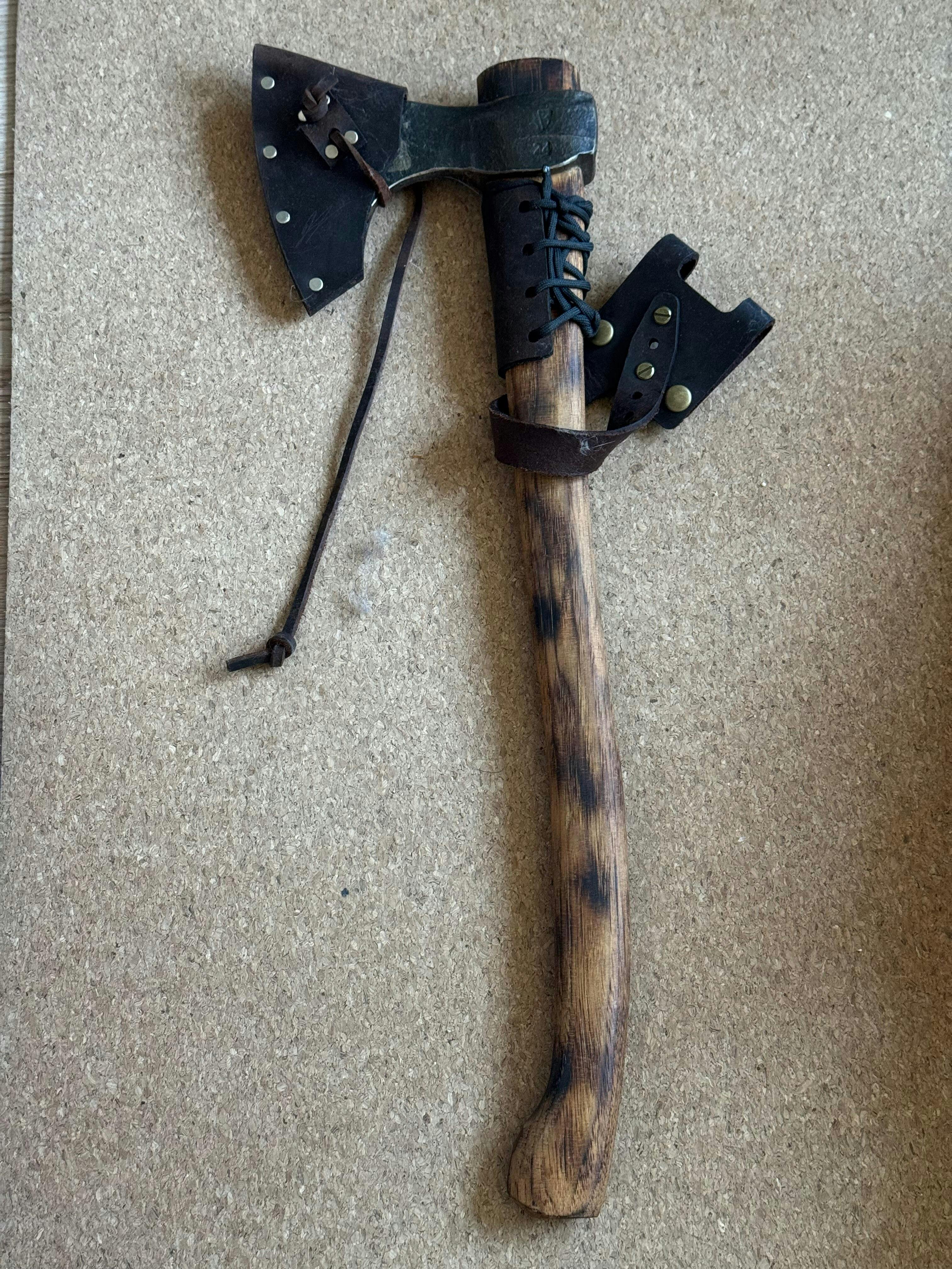 Q: What's included with the axe? A: Complete package includes the hand-forged axe head, 22" curved hickory handle, premium water buffalo leather sheath.